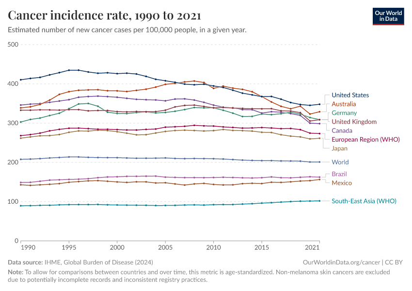 “Data Page: Cancer incidence rate”, part of the following publication: Esteban Ortiz-Ospina and Max Roser (2016) - “Global Health”. Data adapted from IHME, Global Burden of Disease. Retrieved from https://archive.ourworldindata.org/20250909-093708/grapher/cancer-incidence.html [online resource] (archived on September 9, 2025).How to cite this data