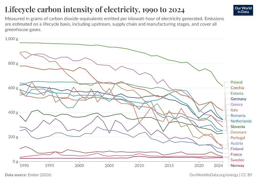 Ember (2026) – with major processing by Our World in Data. “Lifecycle carbon intensity of electricity generation – Ember” [dataset]. Ember, “Yearly Electricity Data Europe”; Ember, “Yearly Electricity Data” [original data]. Retrieved January 15, 2026 from https://archive.ourworldindata.org/20260109-144605/grapher/carbon-intensity-electricity.html (archived on January 9, 2026).