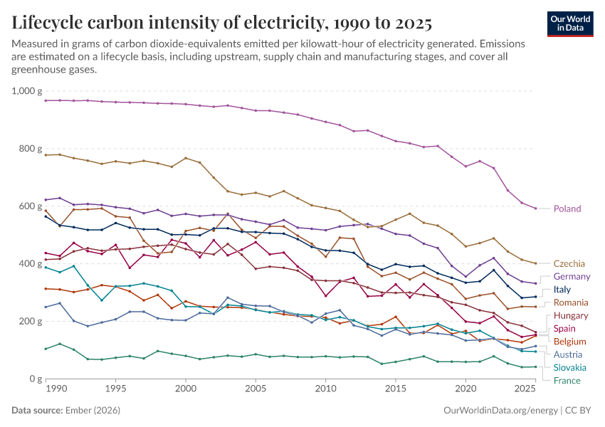 “Data Page: Lifecycle carbon intensity of electricity generation”, part of the following publication: Hannah Ritchie, Pablo Rosado, and Max Roser (2023) - “Energy”. Data adapted from Ember. Retrieved from https://archive.ourworldindata.org/20260128-110227/grapher/carbon-intensity-electricity.html [online resource] (archived on January 28, 2026).How to cite this data