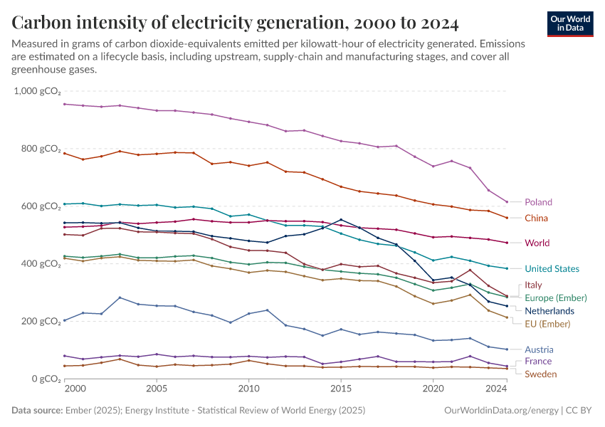 Ember (2025); Energy Institute - Statistical Review of World Energy (2025) – with major processing by Our World in Data. “Carbon intensity of electricity generation – Ember” [dataset]. Ember, “Yearly Electricity Data Europe”; Ember, “Yearly Electricity Data”; Energy Institute, “Statistical Review of World Energy” [original data]. Retrieved December 13, 2025 from https://archive.ourworldindata.org/20251014-145858/grapher/carbon-intensity-electricity.html (archived on October 14, 2025).
