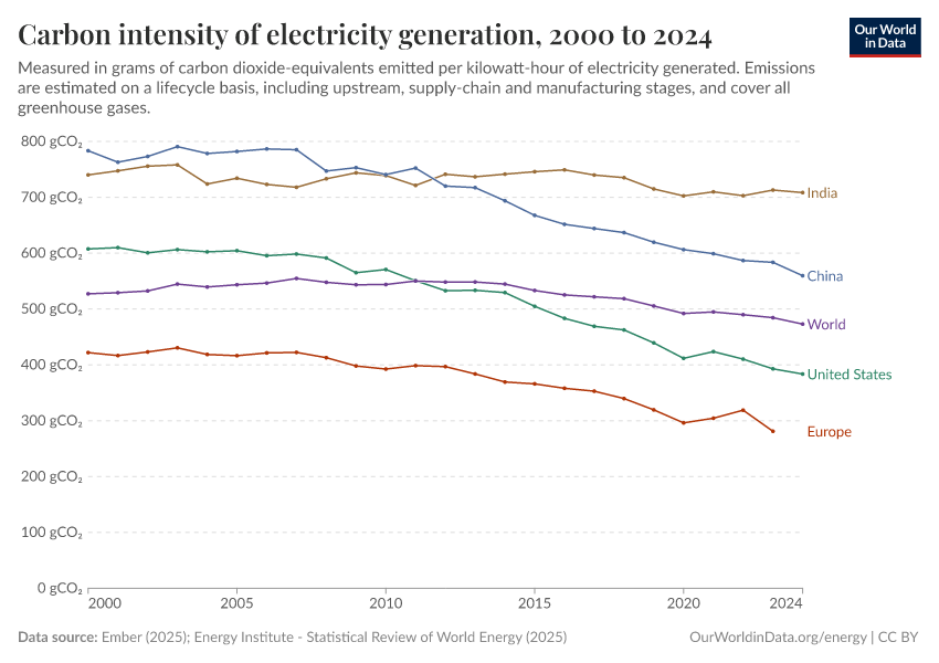 Ember (2025); Energy Institute - Statistical Review of World Energy (2025) – with major processing by Our World in Data. “Carbon intensity of electricity generation – Ember” [dataset]. Ember, “Yearly Electricity Data Europe”; Ember, “Yearly Electricity Data”; Energy Institute, “Statistical Review of World Energy” [original data]. Retrieved December 12, 2025 from https://archive.ourworldindata.org/20251014-145858/grapher/carbon-intensity-electricity.html (archived on October 14, 2025).
