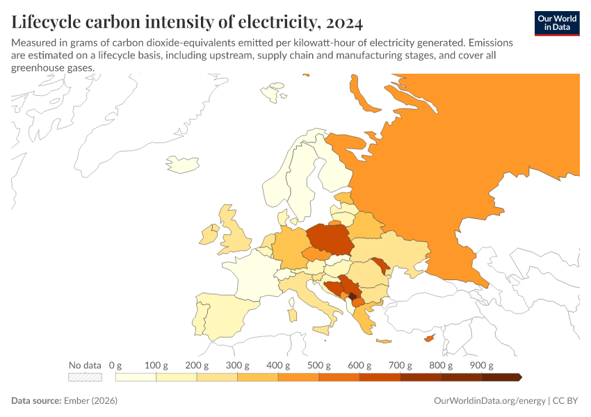 Ember (2026) – with major processing by Our World in Data. “Lifecycle carbon intensity of electricity generation – Ember” [dataset]. Ember, “Yearly Electricity Data Europe”; Ember, “Yearly Electricity Data” [original data]. Retrieved January 16, 2026 from https://archive.ourworldindata.org/20260109-144605/grapher/carbon-intensity-electricity.html (archived on January 9, 2026).