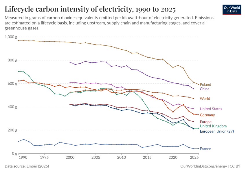 “Data Page: Carbon intensity of electricity generation”, part of the following publication: Hannah Ritchie, Pablo Rosado, and Max Roser (2023) - “Energy”. Data adapted from Ember, Energy Institute. Retrieved from https://archive.ourworldindata.org/20251014-145858/grapher/carbon-intensity-electricity.html [online resource] (archived on October 14, 2025).How to cite this data