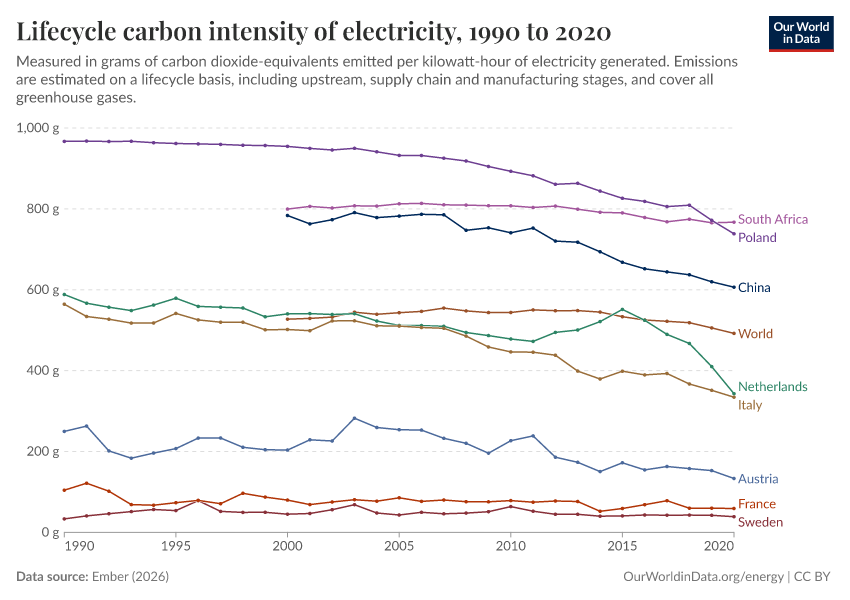 “Data Page: Lifecycle carbon intensity of electricity generation”, part of the following publication: Hannah Ritchie, Pablo Rosado, and Max Roser (2023) - “Energy”. Data adapted from Ember. Retrieved from https://archive.ourworldindata.org/20260417-112857/grapher/carbon-intensity-electricity.html [online resource] (archived on April 17, 2026).How to cite this data