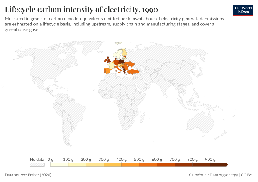 Ember (2026) – with major processing by Our World in Data. “Lifecycle carbon intensity of electricity generation – Ember” [dataset]. Ember, “Yearly Electricity Data Europe”; Ember, “Yearly Electricity Data” [original data]. Retrieved April 1, 2026 from https://archive.ourworldindata.org/20260304-094028/grapher/carbon-intensity-electricity.html (archived on March 4, 2026).Download