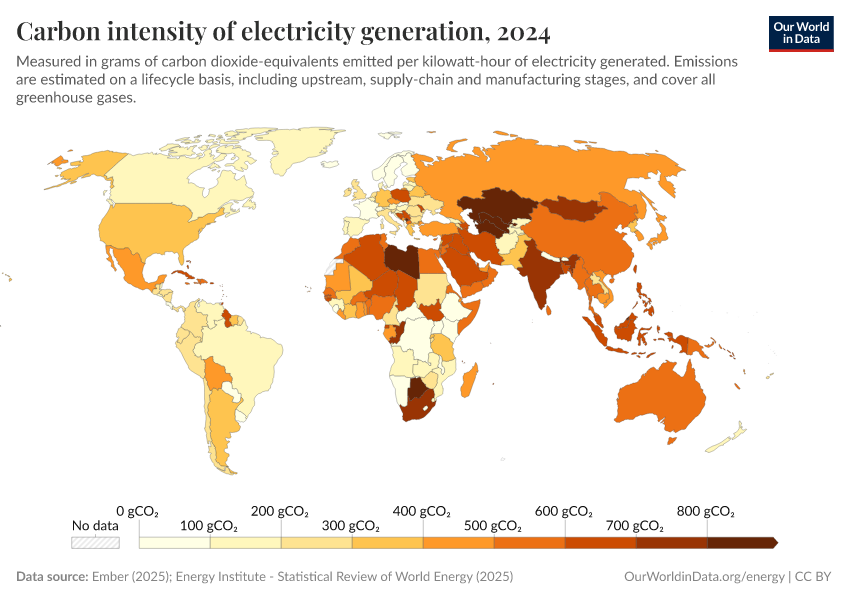 “Data Page: Carbon intensity of electricity generation”, part of the following publication: Hannah Ritchie, Pablo Rosado, and Max Roser (2023) - “Energy”. Data adapted from Ember, Energy Institute. Retrieved from https://archive.ourworldindata.org/20251014-145858/grapher/carbon-intensity-electricity.html [online resource] (archived on October 14, 2025).How to cite this data