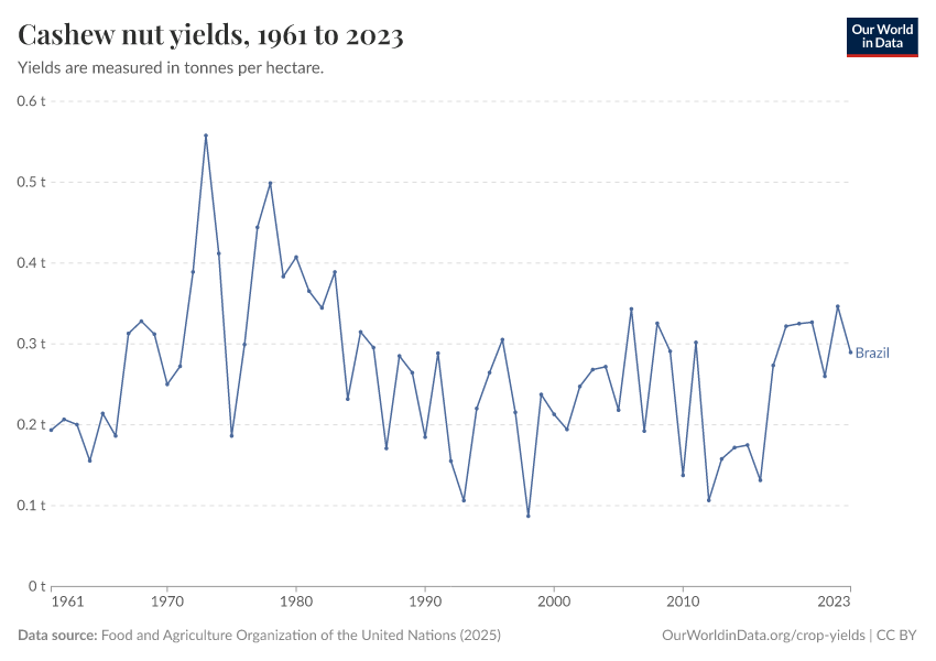 “Data Page: Cashew nut yields”, part of the following publication: Hannah Ritchie, Pablo Rosado, and Max Roser (2023) - “Agricultural Production”. Data adapted from Food and Agriculture Organization of the United Nations. Retrieved from https://archive.ourworldindata.org/20250909-093708/grapher/cashew-nut-yields.html [online resource] (archived on September 9, 2025).How to cite this data