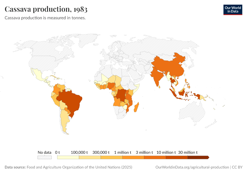 “Data Page: Cassava production”, part of the following publication: Hannah Ritchie, Pablo Rosado, and Max Roser (2023) - “Agricultural Production”. Data adapted from Food and Agriculture Organization of the United Nations. Retrieved from https://archive.ourworldindata.org/20250909-093708/grapher/cassava-production.html [online resource] (archived on September 9, 2025).How to cite this data