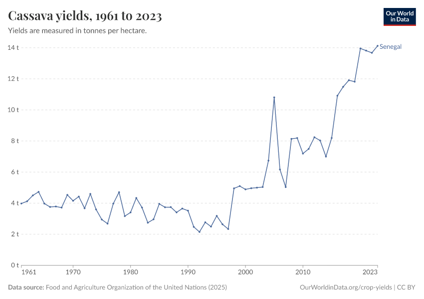 “Data Page: Cassava yields”, part of the following publication: Hannah Ritchie, Pablo Rosado, and Max Roser (2023) - “Agricultural Production”. Data adapted from Food and Agriculture Organization of the United Nations. Retrieved from https://archive.ourworldindata.org/20250909-093708/grapher/cassava-yields.html [online resource] (archived on September 9, 2025).