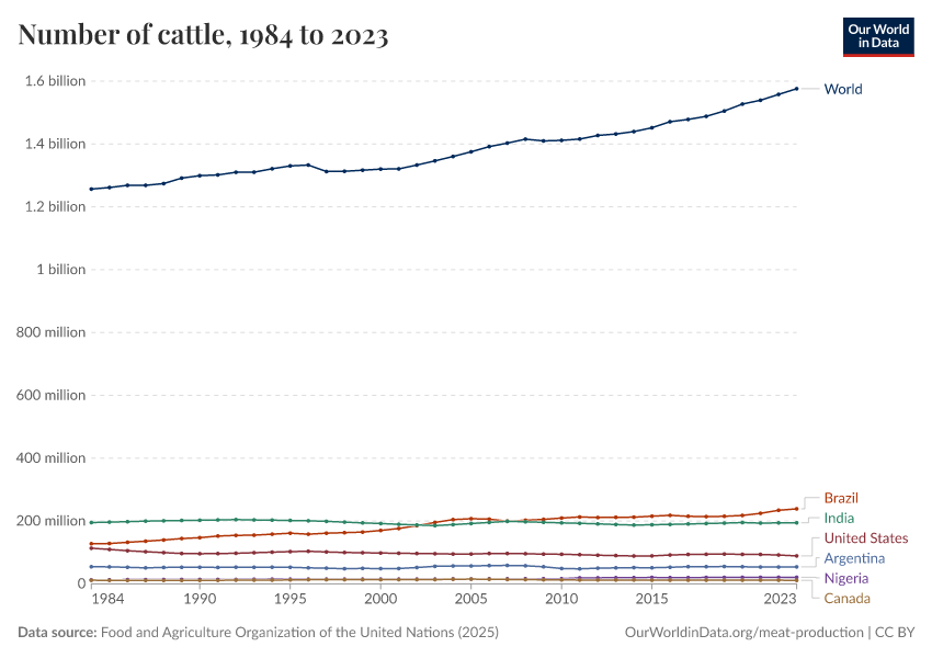 “Data Page: Number of cattle”, part of the following publication: Hannah Ritchie, Pablo Rosado, and Max Roser (2023) - “Agricultural Production”. Data adapted from Food and Agriculture Organization of the United Nations. Retrieved from https://archive.ourworldindata.org/20251014-161652/grapher/cattle-livestock-count-heads.html [online resource] (archived on October 14, 2025).How to cite this data