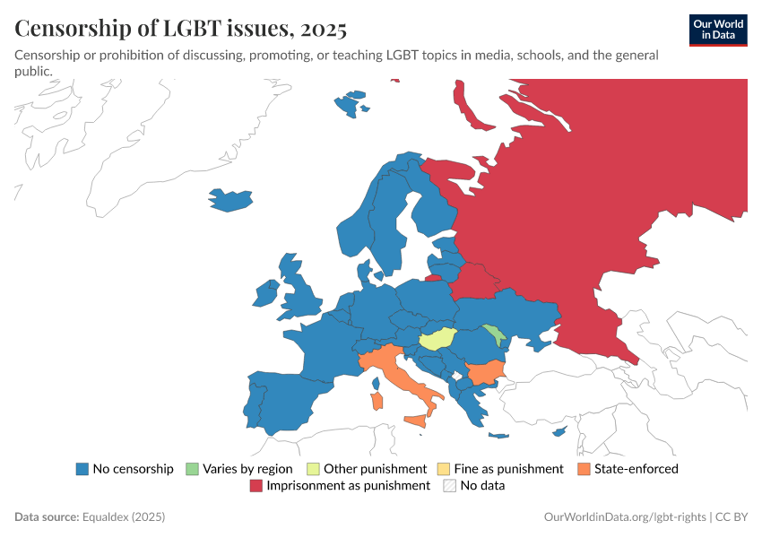 Equaldex (2025) – with major processing by Our World in Data. “Censorship of LGBT+ issues” [dataset]. Equaldex, “Equaldex” [original data]. Retrieved December 16, 2025 from https://archive.ourworldindata.org/20250909-093708/grapher/censorship-of-lgbt-issues.html (archived on September 9, 2025).