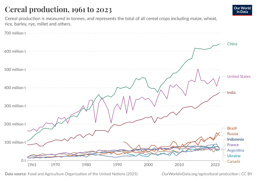 “Data Page: Cereal production”, part of the following publication: Hannah Ritchie, Pablo Rosado, and Max Roser (2023) - “Agricultural Production”. Data adapted from Food and Agriculture Organization of the United Nations. Retrieved from https://archive.ourworldindata.org/20251014-161652/grapher/cereal-production.html [online resource] (archived on October 14, 2025).