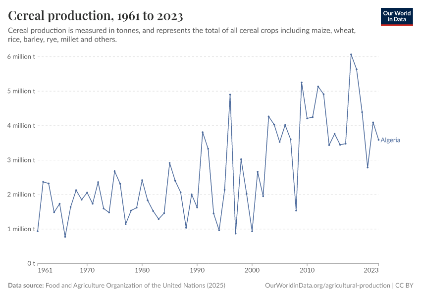 Food and Agriculture Organization of the United Nations (2025) – with major processing by Our World in Data. “Cereal production – UN FAO” [dataset]. Food and Agriculture Organization of the United Nations, “Production: Crops and livestock products” [original data]. Retrieved December 6, 2025 from https://archive.ourworldindata.org/20251014-161652/grapher/cereal-production.html (archived on October 14, 2025).
