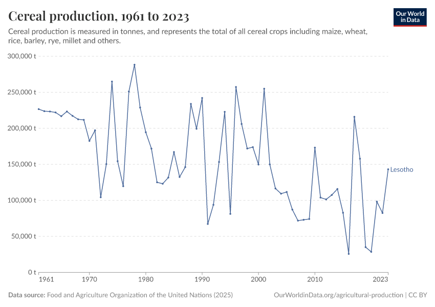Food and Agriculture Organization of the United Nations (2025) – with major processing by Our World in Data. “Cereal production – UN FAO” [dataset]. Food and Agriculture Organization of the United Nations, “Production: Crops and livestock products” [original data]. Retrieved December 5, 2025 from https://archive.ourworldindata.org/20251014-161652/grapher/cereal-production.html (archived on October 14, 2025).