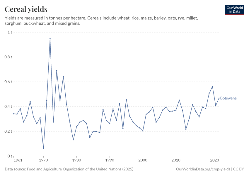 “Data Page: Cereal yields”, part of the following publication: Hannah Ritchie, Pablo Rosado, and Max Roser (2023) - “Agricultural Production”. Data adapted from Food and Agriculture Organization of the United Nations. Retrieved from https://archive.ourworldindata.org/20251014-161652/grapher/cereal-yield.html [online resource] (archived on October 14, 2025).How to cite this data