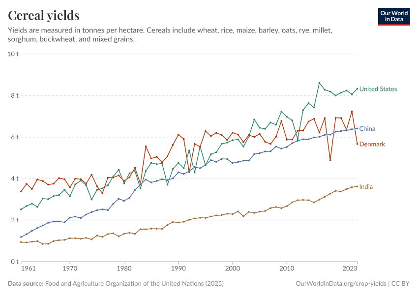 “Data Page: Cereal yields”, part of the following publication: Hannah Ritchie, Pablo Rosado, and Max Roser (2023) - “Agricultural Production”. Data adapted from Food and Agriculture Organization of the United Nations. Retrieved from https://archive.ourworldindata.org/20251014-161652/grapher/cereal-yield.html [online resource] (archived on October 14, 2025).How to cite this data