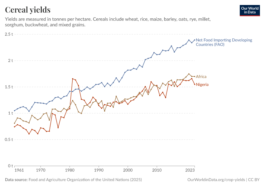 “Data Page: Cereal yields”, part of the following publication: Hannah Ritchie, Pablo Rosado, and Max Roser (2023) - “Agricultural Production”. Data adapted from Food and Agriculture Organization of the United Nations. Retrieved from https://archive.ourworldindata.org/20251014-161652/grapher/cereal-yield.html [online resource] (archived on October 14, 2025).