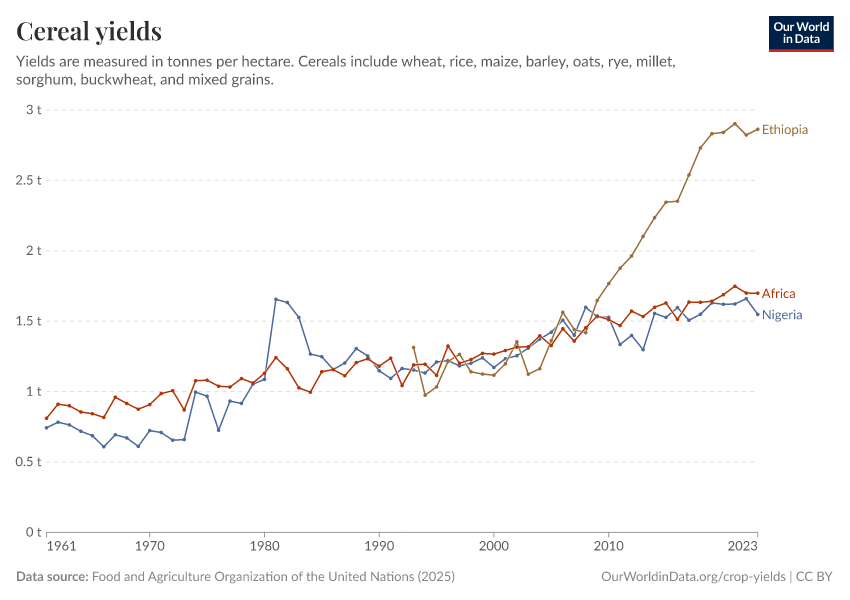 “Data Page: Cereal yields”, part of the following publication: Hannah Ritchie, Pablo Rosado, and Max Roser (2023) - “Agricultural Production”. Data adapted from Food and Agriculture Organization of the United Nations. Retrieved from https://archive.ourworldindata.org/20251014-161652/grapher/cereal-yield.html [online resource] (archived on October 14, 2025).