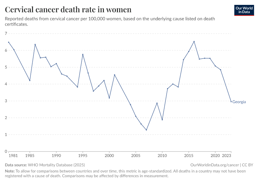 WHO Mortality Database (2025) – with minor processing by Our World in Data. “Cervical cancer death rate in women” [dataset]. WHO Mortality Database, “WHO Mortality Database” [original data]. Retrieved December 5, 2025 from https://archive.ourworldindata.org/20250909-093708/grapher/cervical-cancer-death-rate-in-women.html (archived on September 9, 2025).