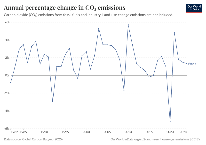 Global Carbon Budget (2025) – with major processing by Our World in Data. “Annual percentage change in CO₂ emissions” [dataset]. Global Carbon Project, “Global Carbon Budget v15” [original data]. Retrieved December 20, 2025 from https://archive.ourworldindata.org/20251204-133459/grapher/change-co2-annual-pct.html (archived on December 4, 2025).