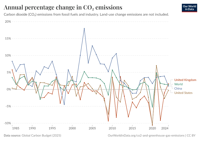 “Data Page: Annual percentage change in CO₂ emissions”, part of the following publication: Hannah Ritchie, Pablo Rosado, and Max Roser (2023) - “CO₂ and Greenhouse Gas Emissions”. Data adapted from Global Carbon Project. Retrieved from https://archive.ourworldindata.org/20251204-133459/grapher/change-co2-annual-pct.html [online resource] (archived on December 4, 2025).How to cite this data