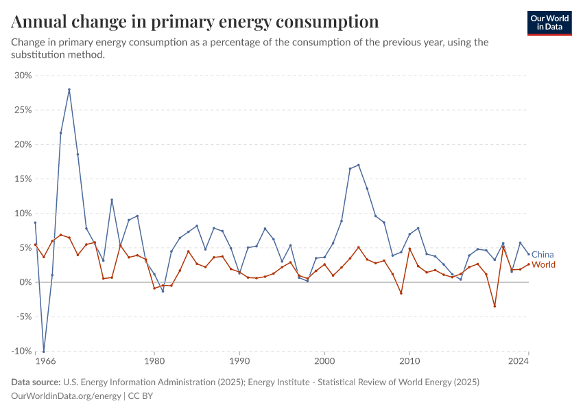 U.S. Energy Information Administration (2025); Energy Institute - Statistical Review of World Energy (2025) – with major processing by Our World in Data. “Annual change in primary energy consumption” [dataset]. U.S. Energy Information Administration, “International Energy Data”; Energy Institute, “Statistical Review of World Energy” [original data]. Retrieved January 13, 2026 from https://archive.ourworldindata.org/20250909-093708/grapher/change-energy-consumption.html (archived on September 9, 2025).