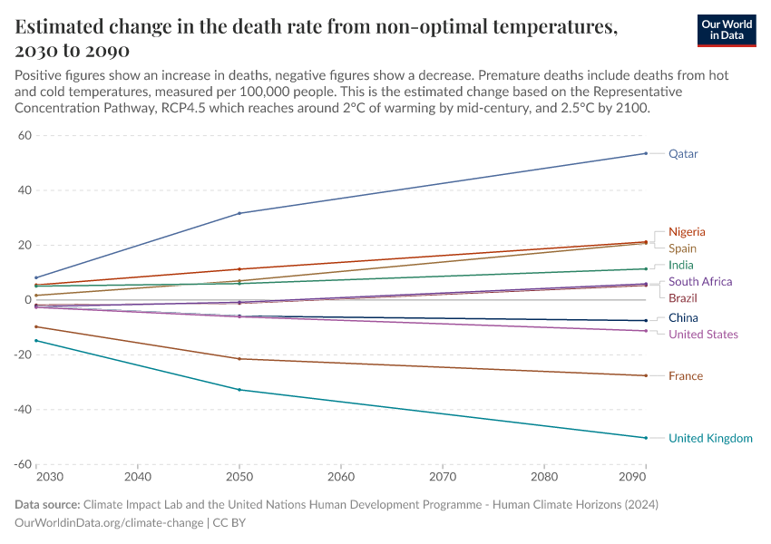 “Data Page: Estimated change in the death rate from non-optimal temperatures”. Our World in Data (2025). Data adapted from Climate Impact Lab and the United Nations Human Development Programme. Retrieved from https://archive.ourworldindata.org/20250909-093708/grapher/change-heat-death-rate.html [online resource] (archived on September 9, 2025).How to cite this data