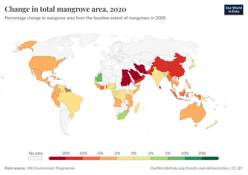 “Data Page: Change in total mangrove area”. Our World in Data (2026). Data adapted from UN Environment Programme. Retrieved from https://archive.ourworldindata.org/20260304-094028/grapher/change-in-total-mangrove-area.html [online resource] (archived on March 4, 2026).How to cite this data