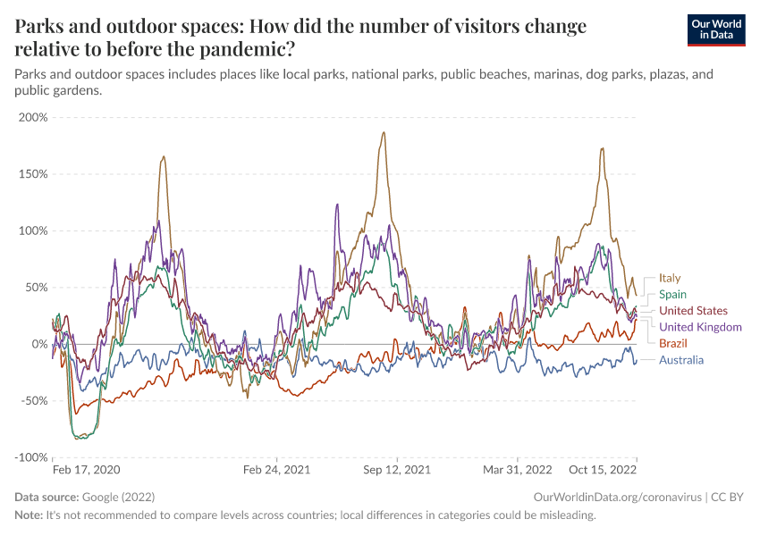 Google (2022) – with minor processing by Our World in Data. “Parks and outdoor spaces: How did the number of visitors change relative to before the pandemic?” [dataset]. Google, “COVID-19, Community Mobility Reports” [original data]. Retrieved December 20, 2025 from https://archive.ourworldindata.org/20250909-093708/grapher/change-visitors-parks-covid.html (archived on September 9, 2025).