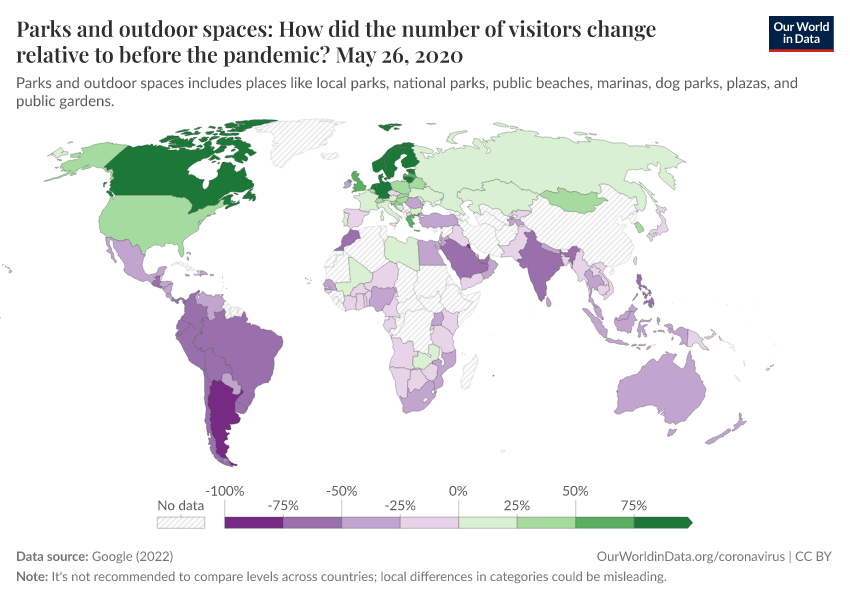 Google (2022) – with minor processing by Our World in Data. “Parks and outdoor spaces: How did the number of visitors change relative to before the pandemic?” [dataset]. Google, “COVID-19, Community Mobility Reports” [original data]. Retrieved January 14, 2026 from https://archive.ourworldindata.org/20250909-093708/grapher/change-visitors-parks-covid.html (archived on September 9, 2025).