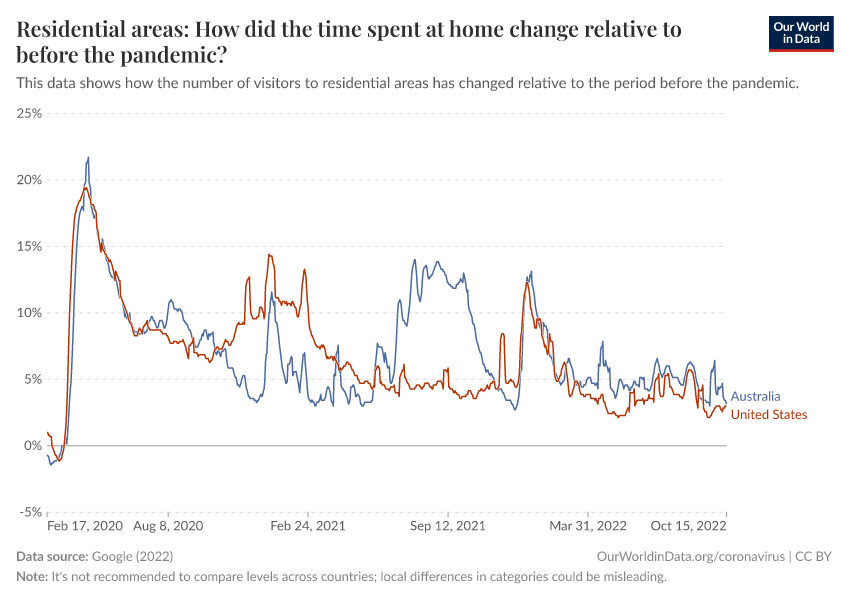 Google (2022) – with minor processing by Our World in Data. “Residential areas: How did the time spent at home change relative to before the pandemic?” [dataset]. Google, “COVID-19, Community Mobility Reports” [original data]. Retrieved December 20, 2025 from https://archive.ourworldindata.org/20250909-093708/grapher/changes-residential-duration-covid.html (archived on September 9, 2025).