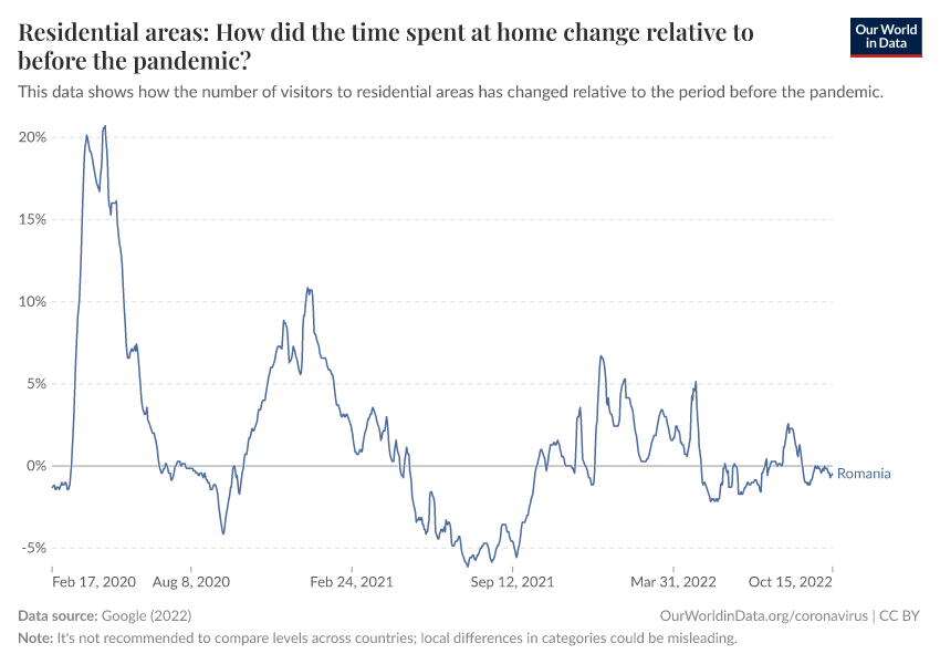 “Data Page: Residential areas: How did the time spent at home change relative to before the pandemic?”, part of the following publication: Edouard Mathieu, Hannah Ritchie, Lucas Rodés-Guirao, Cameron Appel, Daniel Gavrilov, Charlie Giattino, Joe Hasell, Bobbie Macdonald, Saloni Dattani, Diana Beltekian, Esteban Ortiz-Ospina, and Max Roser (2020) - “COVID-19 Pandemic”. Data adapted from Google. Retrieved from https://archive.ourworldindata.org/20250909-093708/grapher/changes-residential-duration-covid.html [online resource] (archived on September 9, 2025).How to cite this data
