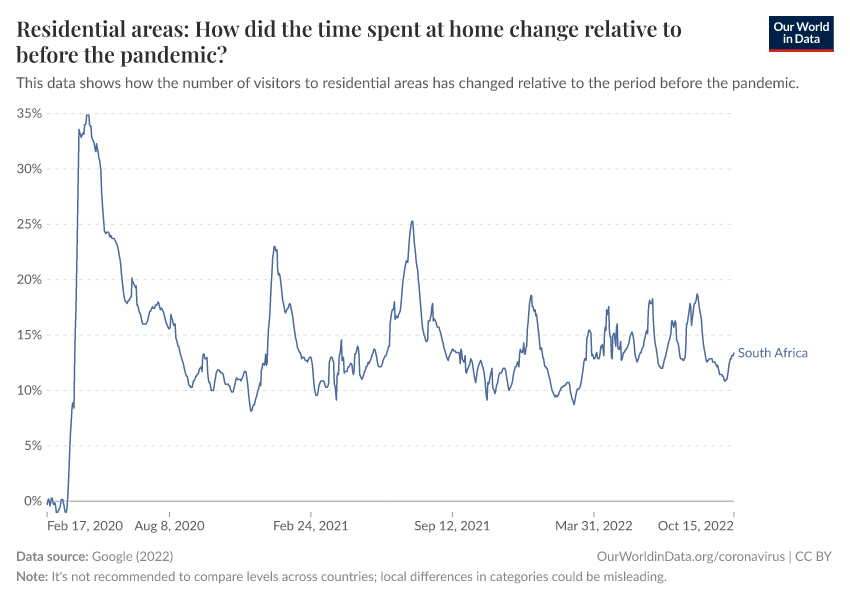 Google (2022) – with minor processing by Our World in Data. “Residential areas: How did the time spent at home change relative to before the pandemic?” [dataset]. Google, “COVID-19, Community Mobility Reports” [original data]. Retrieved December 19, 2025 from https://archive.ourworldindata.org/20250909-093708/grapher/changes-residential-duration-covid.html (archived on September 9, 2025).