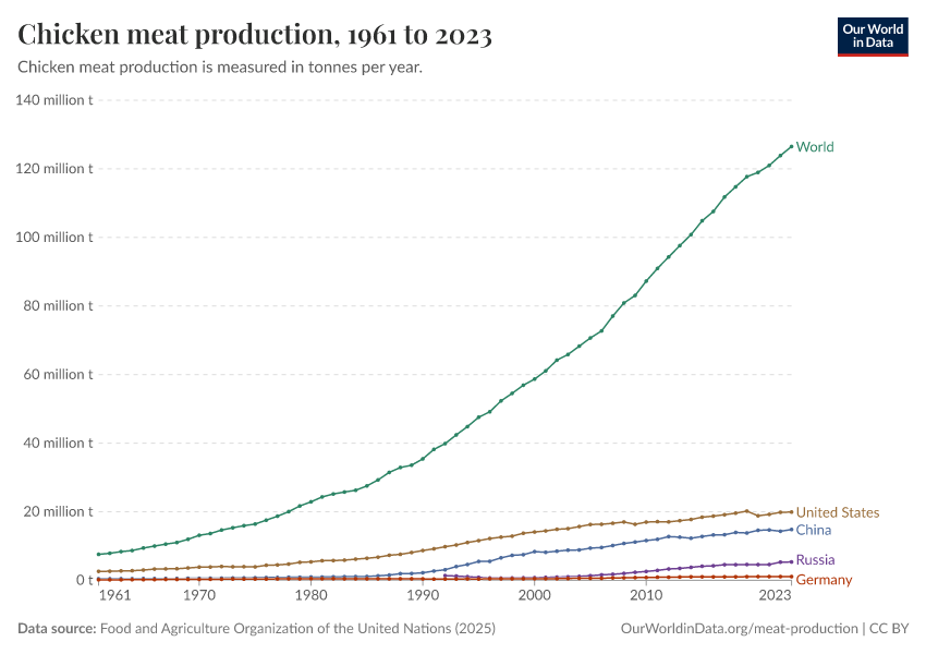 “Data Page: Chicken meat production”, part of the following publication: Hannah Ritchie, Pablo Rosado, and Max Roser (2023) - “Agricultural Production”. Data adapted from Food and Agriculture Organization of the United Nations. Retrieved from https://archive.ourworldindata.org/20251014-161652/grapher/chicken-meat-production.html [online resource] (archived on October 14, 2025).