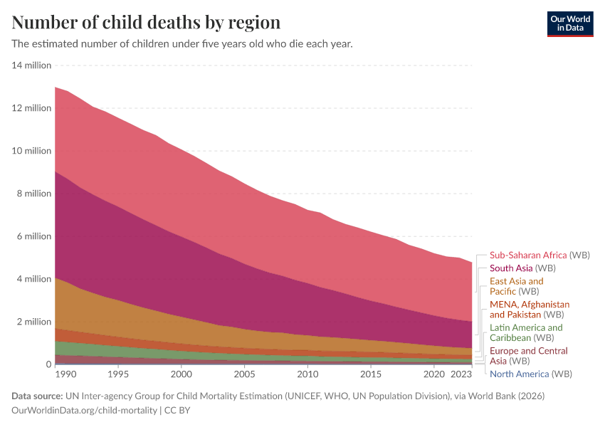 UN Inter-agency Group for Child Mortality Estimation (UNICEF, WHO, UN Population Division), via World Bank (2026) – processed by Our World in Data. “Number of child deaths by region” [dataset]. UN Inter-agency Group for Child Mortality Estimation (UNICEF, WHO, UN Population Division), via World Bank, “World Development Indicators 125” [original data]. Retrieved March 12, 2026 from https://archive.ourworldindata.org/20260304-094028/grapher/child-deaths-igme-data.html (archived on March 4, 2026).