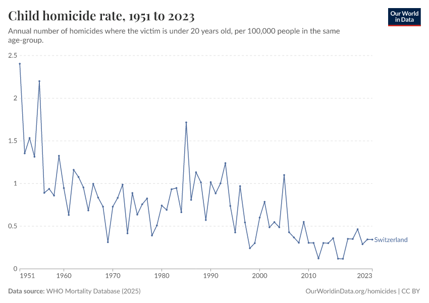 WHO Mortality Database (2025) – with minor processing by Our World in Data. “Child homicide rate” [dataset]. WHO Mortality Database, “WHO Mortality Database” [original data]. Retrieved January 16, 2026 from https://archive.ourworldindata.org/20260105-133053/grapher/child-homicide-rate.html (archived on January 5, 2026).