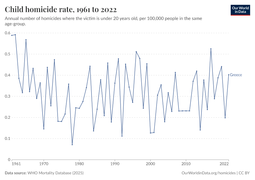 WHO Mortality Database (2025) – with minor processing by Our World in Data. “Child homicide rate” [dataset]. WHO Mortality Database, “WHO Mortality Database” [original data]. Retrieved January 14, 2026 from https://archive.ourworldindata.org/20260105-133053/grapher/child-homicide-rate.html (archived on January 5, 2026).