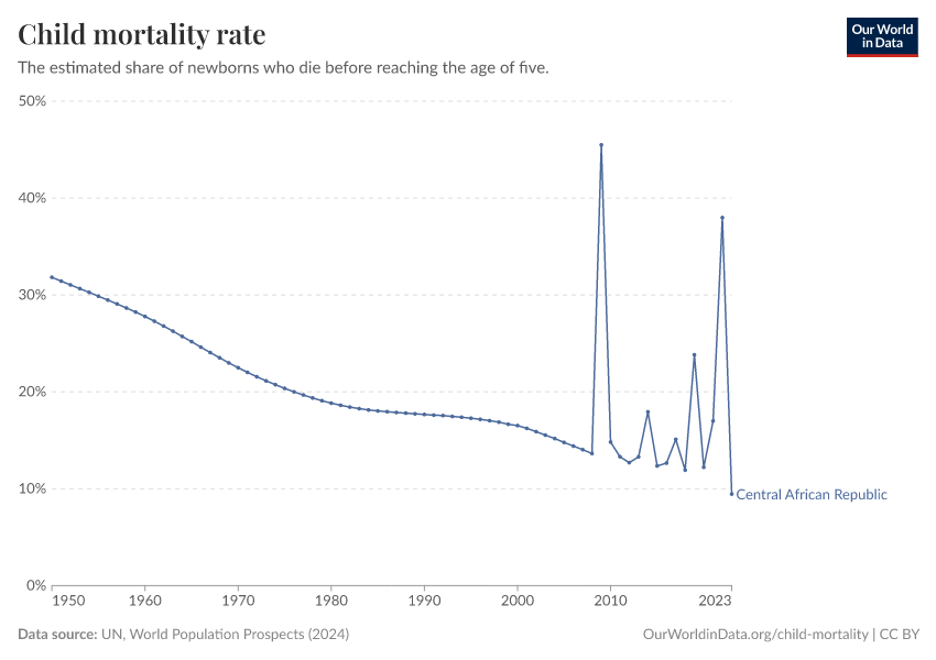UN, World Population Prospects (2024) – processed by Our World in Data. “Child mortality rate, ages 0-4 – UN WPP” [dataset]. United Nations, “World Population Prospects” [original data]. Retrieved December 5, 2025 from https://archive.ourworldindata.org/20250925-232706/grapher/child-mortality-around-the-world.html (archived on September 25, 2025).