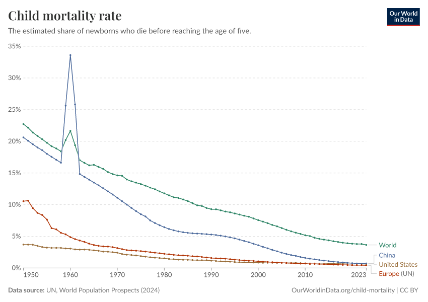 “Data Page: Child mortality rate, ages 0-4”. Our World in Data (2026). Data adapted from United Nations. Retrieved from https://archive.ourworldindata.org/20260402-161824/grapher/child-mortality-around-the-world.html [online resource] (archived on April 2, 2026).How to cite this data