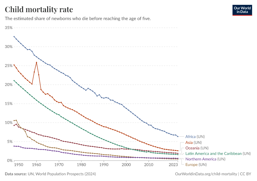 UN, World Population Prospects (2024) – processed by Our World in Data. “Child mortality rate, ages 0-4 – UN WPP” [dataset]. United Nations, “World Population Prospects” [original data]. Retrieved January 21, 2026 from https://archive.ourworldindata.org/20250925-232706/grapher/child-mortality-around-the-world.html (archived on September 25, 2025).