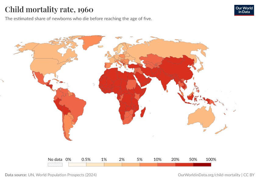 UN, World Population Prospects (2024) – processed by Our World in Data. “Child mortality rate, ages 0-4 – UN WPP” [dataset]. United Nations, “World Population Prospects” [original data]. Retrieved December 13, 2025 from https://archive.ourworldindata.org/20250925-232706/grapher/child-mortality-around-the-world.html (archived on September 25, 2025).