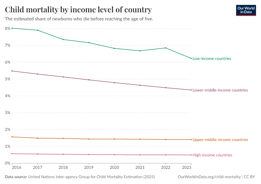 “Data Page: Child mortality rate”, part of the following publication: Saloni Dattani, Fiona Spooner, Hannah Ritchie, and Max Roser (2023) - “Child and Infant Mortality”. Data adapted from United Nations Inter-agency Group for Child Mortality Estimation, Various sources. Retrieved from https://archive.ourworldindata.org/20260304-094028/grapher/child-mortality-by-income-level-of-country.html [online resource] (archived on March 4, 2026).How to cite this data
