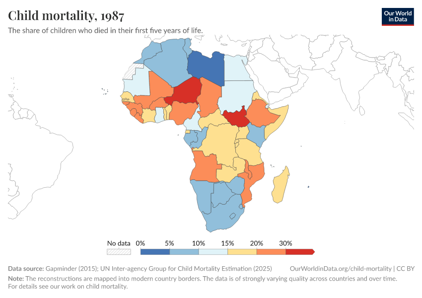 Gapminder (2015); UN Inter-agency Group for Child Mortality Estimation (2025) – processed by Our World in Data. “Child mortality” [dataset]. United Nations Inter-agency Group for Child Mortality Estimation, “United Nations Inter-agency Group for Child Mortality Estimation”; Gapminder based on UN IGME & UN WPP, “Under-five Mortality v11”; Various sources, “Population” [original data]. Retrieved December 11, 2025 from https://archive.ourworldindata.org/20251023-195030/grapher/child-mortality-complete-gapminder.html (archived on October 23, 2025).