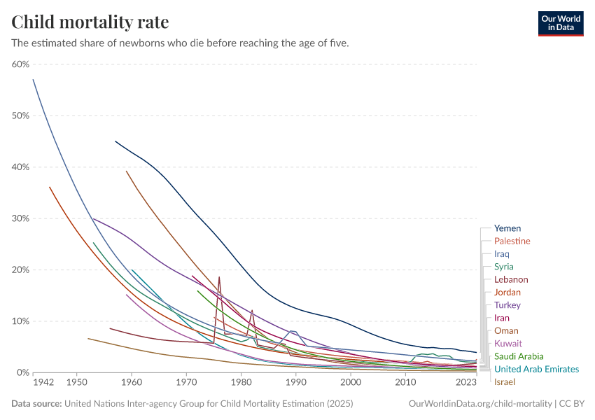 United Nations Inter-agency Group for Child Mortality Estimation (2025) – with major processing by Our World in Data. “Child mortality rate” [dataset]. United Nations Inter-agency Group for Child Mortality Estimation, “United Nations Inter-agency Group for Child Mortality Estimation”; Various sources, “Population” [original data]. Retrieved December 12, 2025 from https://archive.ourworldindata.org/20250925-233948/grapher/child-mortality-igme.html (archived on September 25, 2025).