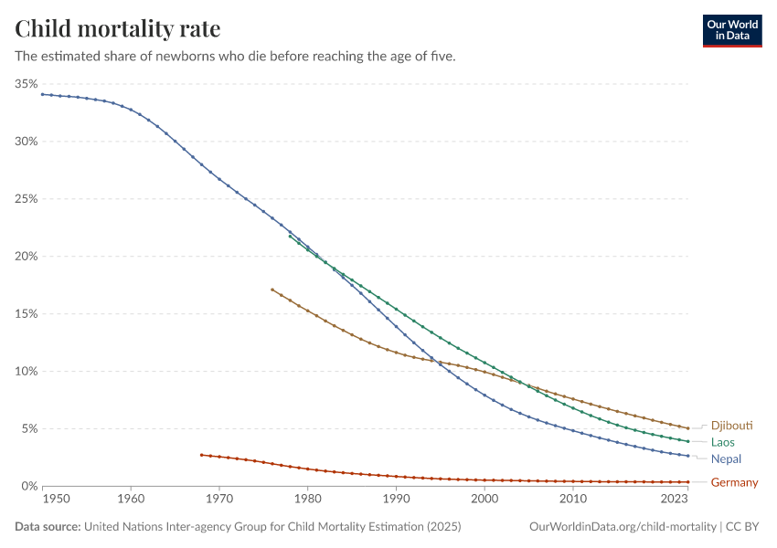 “Data Page: Child mortality rate”, part of the following publication: Saloni Dattani, Fiona Spooner, Hannah Ritchie, and Max Roser (2023) - “Child and Infant Mortality”. Data adapted from United Nations Inter-agency Group for Child Mortality Estimation, Various sources. Retrieved from https://archive.ourworldindata.org/20260304-094028/grapher/child-mortality-igme.html [online resource] (archived on March 4, 2026).How to cite this data