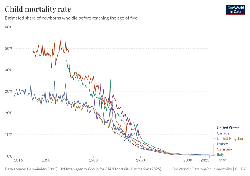 Gapminder (2015); UN Inter-agency Group for Child Mortality Estimation (2025) – processed by Our World in Data. “Child mortality rate – Gapminder; UN IGME – Long-run data” [dataset]. United Nations Inter-agency Group for Child Mortality Estimation, “United Nations Inter-agency Group for Child Mortality Estimation”; Gapminder, “Child mortality rate under age five v7”; Gapminder based on UN IGME & UN WPP, “Under-five Mortality v11”; Various sources, “Population” [original data]. Retrieved December 6, 2025 from https://archive.ourworldindata.org/20251023-195030/grapher/child-mortality.html (archived on October 23, 2025).