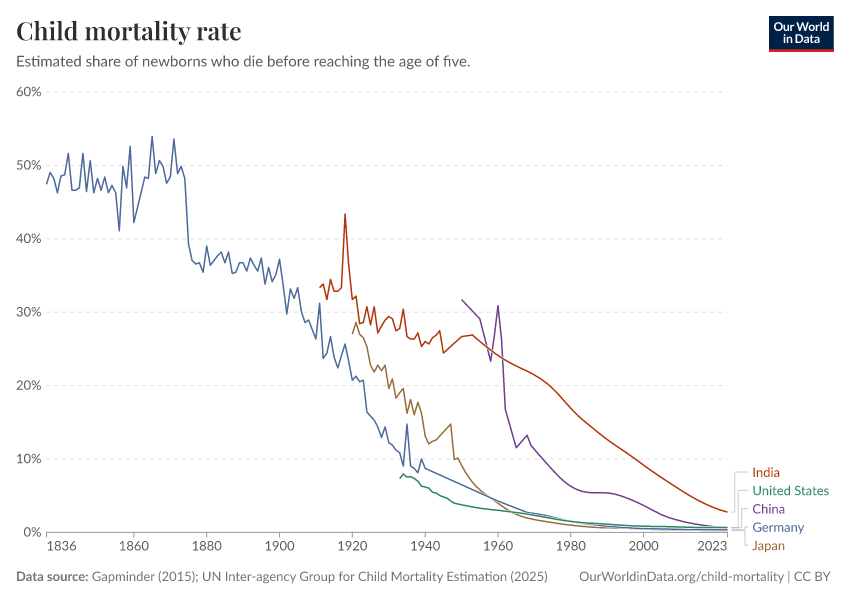Gapminder (2015); UN Inter-agency Group for Child Mortality Estimation (2025) – processed by Our World in Data. “Child mortality rate – Gapminder; UN IGME – Long-run data” [dataset]. United Nations Inter-agency Group for Child Mortality Estimation, “United Nations Inter-agency Group for Child Mortality Estimation”; Gapminder, “Child mortality rate under age five v7”; Gapminder based on UN IGME & UN WPP, “Under-five Mortality v11”; Various sources, “Population” [original data]. Retrieved April 2, 2026 from https://archive.ourworldindata.org/20260316-161256/grapher/child-mortality.html (archived on March 16, 2026).Download
