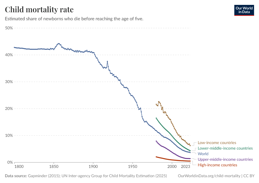 Gapminder (2015); UN Inter-agency Group for Child Mortality Estimation (2025) – processed by Our World in Data. “Child mortality rate – Gapminder; UN IGME – Long-run data” [dataset]. United Nations Inter-agency Group for Child Mortality Estimation, “United Nations Inter-agency Group for Child Mortality Estimation”; Gapminder, “Child mortality rate under age five v7”; Gapminder based on UN IGME & UN WPP, “Under-five Mortality v11”; Various sources, “Population” [original data]. Retrieved November 8, 2025 from https://archive.ourworldindata.org/20251023-195030/grapher/child-mortality.html (archived on October 23, 2025).