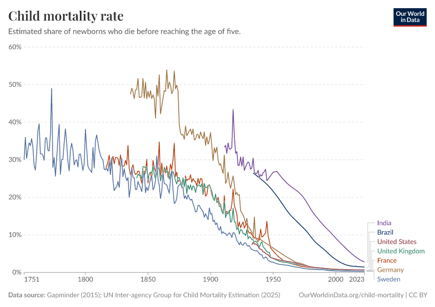 Gapminder (2015); UN Inter-agency Group for Child Mortality Estimation (2025) – processed by Our World in Data. “Child mortality rate – Gapminder; UN IGME – Long-run data” [dataset]. United Nations Inter-agency Group for Child Mortality Estimation, “United Nations Inter-agency Group for Child Mortality Estimation”; Gapminder, “Child mortality rate under age five v7”; Gapminder based on UN IGME & UN WPP, “Under-five Mortality v11”; Various sources, “Population” [original data]. Retrieved December 10, 2025 from https://archive.ourworldindata.org/20251023-195030/grapher/child-mortality.html (archived on October 23, 2025).