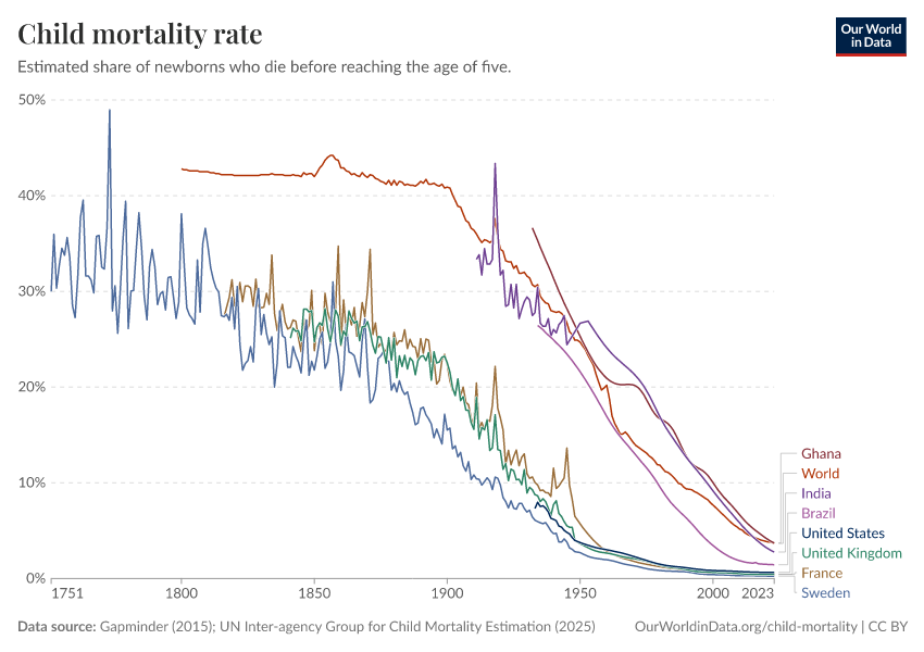 Gapminder (2015); UN Inter-agency Group for Child Mortality Estimation (2025) – processed by Our World in Data. “Child mortality rate – Gapminder; UN IGME – Long-run data” [dataset]. United Nations Inter-agency Group for Child Mortality Estimation, “United Nations Inter-agency Group for Child Mortality Estimation”; Gapminder, “Child mortality rate under age five v7”; Gapminder based on UN IGME & UN WPP, “Under-five Mortality v11”; Various sources, “Population” [original data]. Retrieved January 13, 2026 from https://archive.ourworldindata.org/20251023-195030/grapher/child-mortality.html (archived on October 23, 2025).